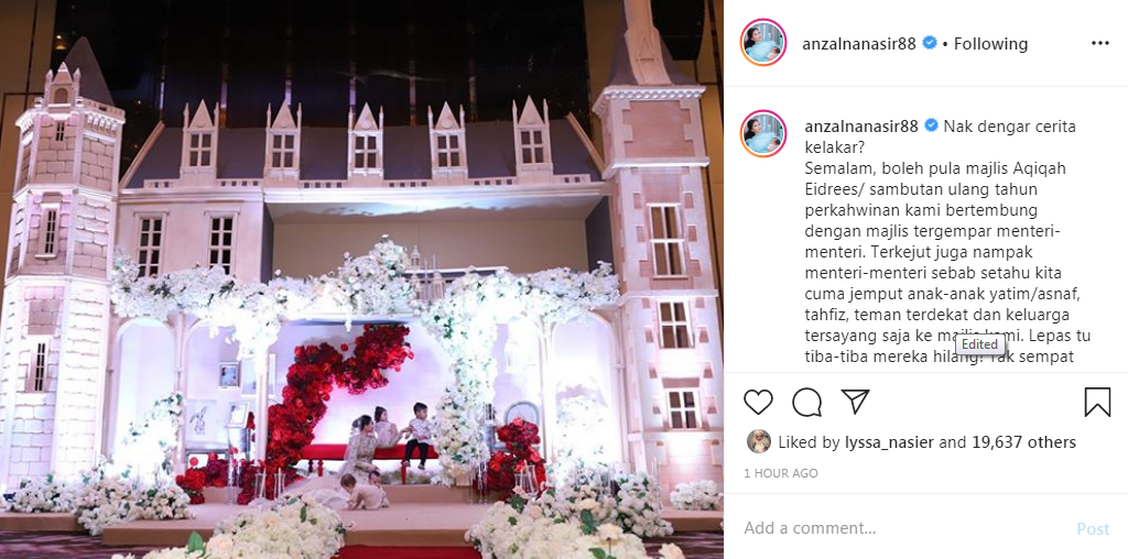 Menerusi akaun Instagram, Anzalna Nasir telah berkongsi sekeping gambar beserta kapsyen yang mencuit hati. Rupa-rupanya ada kej4dian lucu yang jadi semasa majlis aqiqah dan sambutan ulangtahun perkahwinannya itu semalam di Sherat0n hotel. Ayat last tu lucu sangat Anzalna ni !