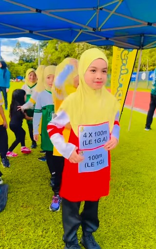 Aafiyah kini sudah berusia 7 tahun menyertai acara lari 4 x 100m dan 100m. Baju Aafiyah berwarna merah semestinya Aafiyah mewakili rumah merah. Dari gaya Aafiyah dapat dilihat Aafiyah mempunyai bakat untuk menjadi seorang atlet seperti ibunya ketika di zaman persekolahan.