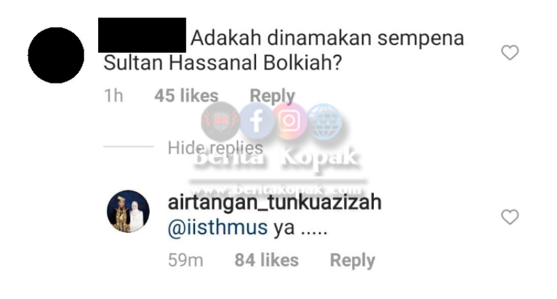 Apa yang lebih menarik perhatian, terdapat satu pers0alan daripada netizen berikutan nama yang diberikan kepada Tengku Hassanal. Seorang netizen bertanya adakah nama Tengku Hassanal diambil daripada nama raja Brunei iaitu Sultan Hassanal B0lkiah. Tengku Azizah menjawab “ya” bagi soalan yang diajukan tersebut.