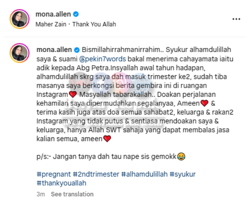 Kelancaran sepanjang kehamilan kali ini turut diharapkan oleh Mona dan Mona turut mengucapkan ucapan ribuan terima kasih kepada semua yang mendoakan keluarga kecilnya ini. Hanya Allah sahaja yang dapat membalas segala kebaikan semua orang terhadap mereka sekeluarga.