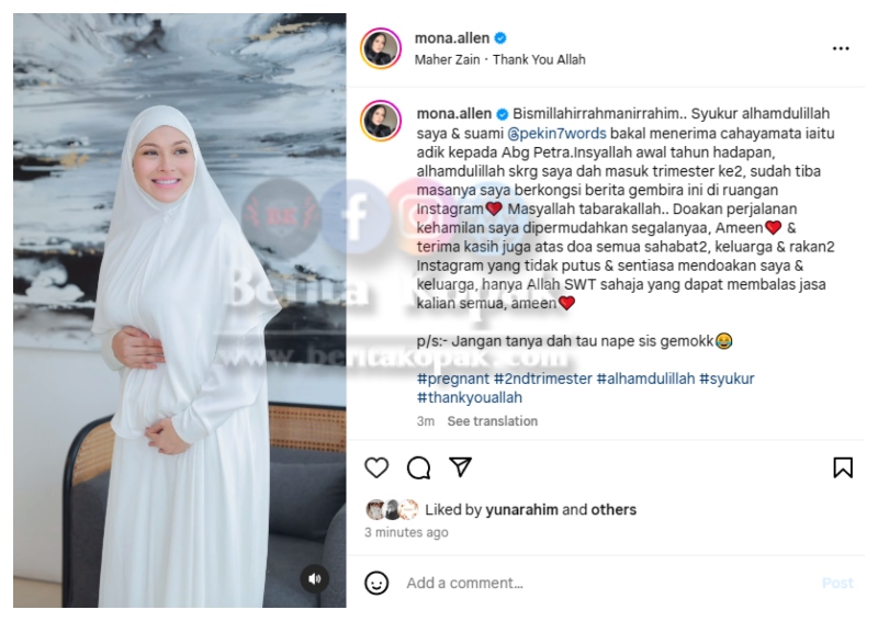 Pada penghujung kapsyen, Mona sempat berseloroh agar tidak ada lagi yang bertanya mengapa dia gemuk. Ayu sungguh Mona dalam busana jubah dan hijab putihnya itu. Pada paparan gambar kedua pula dapat dilihat baby bump Mona yang semakin jelas kelihatan.