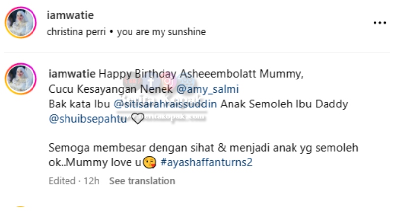 ” Love sangat tengok Watie layan anak-anak. Nampak keikhlasan watie jaga anak-anak shuib. WAtie tak pernah lupa sebut ibu kan.. baiknya Watie ni.. Happy Birthday Ayyash.. ”