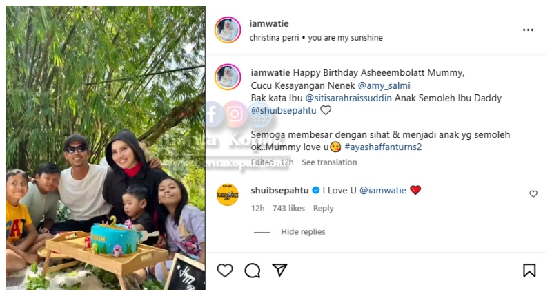 Meninjau akaun Instagram Watie Hanifiah, telah dikongsikan gambar-gambar yang memaparkan suasana ketika mereka sekeluarga menyambut ulangtahun kelahiran Ayash. Watie turut berkongsikan banyak gambar throwback yang tidak pernah dikongsikan sebelum ini bersama Ayash dan anak-anak.