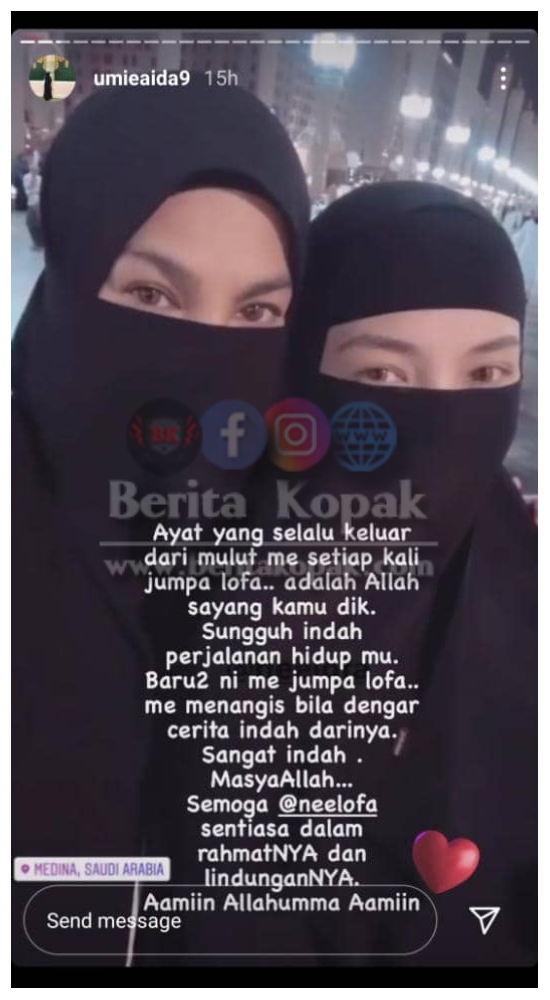 Yang terbaru, menerusi Instagram Story, Datin Seri Umie Aida telah berkongsi gambar thr0wback ketika bersama Neelofa di tanah suci Mekah. Umie menyatakan dirinya menang1s ketika berjumpa dengan Neelofa baru-baru ini dan mendengar kisah yang indah-indah daripada selebriti kesayangan ramai itu.