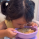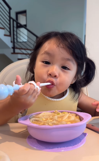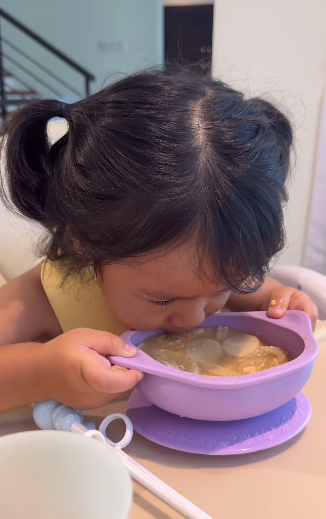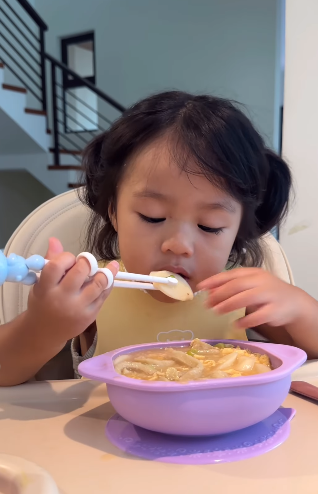 Walaupun menggunakan chopstick, Rina boleh makan tanpa comot dan juga tidak tumpah. Nampaknya ini sangat memudahkan kerja Maryam kerana Rina sudah pandai berdikari dengan sendiri ketika makan. Salah satu kelegaan buat ibu-ibu.