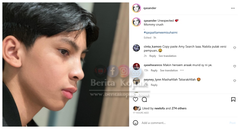Seperti melihat Datuk Amy versi remaja, itu yang dikatakan oleh warganet. Memang saling tidak tumpah wajah Qaqa dengan wajah papanya itu. Hidung mancung terpacak dan bentuk bibir yang sama dengan Datuk Amy. Senakin besar, semakin handsome Qaqa ni.