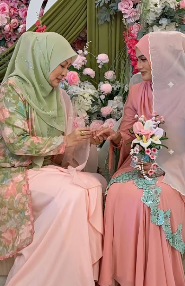Majlis bertemakan warna matcha strawberry ini sangat indah dengan pelamin yang dihiasi bunga mawar berwarna pink. Penampilan Abby juga cukup cantik dan anggun sehingga ramai netizen memuji kecantikan Abby yang tidak dimamah usia.