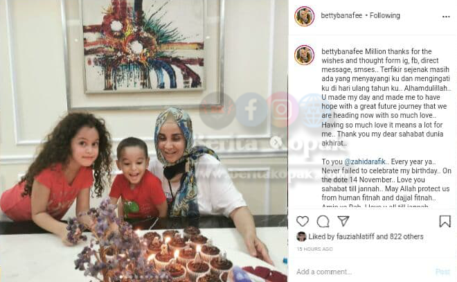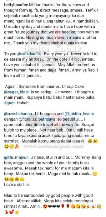 ” Happy birthday dear Betty. Happy Birthday kak bettybanafee sayang. Semoga sihat & ceria selalu. Hug & kisses, Semoga segala hajat baikmu Allah perkenankan, hidup penuh baraqah bersama anak2 yang soleh dan solehah, aamin.. “