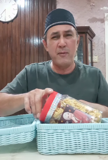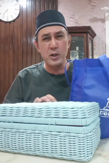 Kelihatan ada beg biru itu mempunyai satu bekas Nata De Coco dan satu minuman. Dalam beg rotan pula, Erra telah menghadiahkan sebalang kuih raya, kain pelikat dan tasbih digital. Namun apa yang mencuit hati adalah telatah Roy menyebut nama-nama makanan yang diterimanya itu.