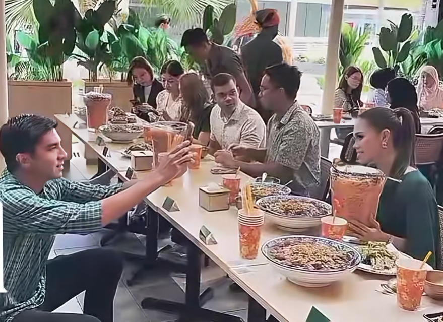” Korang nampak tu depa makan sekali satu mangkuk tau, betul lah tu mereka tak membazir, membazir kan amalan syaitooon. hehe.. “