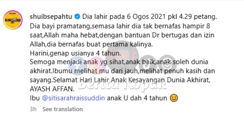 Perkongsian Shuib Sepahtu sempena hari kelahiran anak bongsunya, Ayash Affan yang ke 4 tahun buat ramai tersentuh. Ayash memang anak yang kuat, sama macam arwah ibunya, Siti Sarah. Gambar yang terakhir tu sebak sangat tengok..