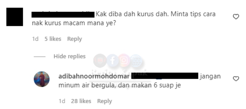 Adibah juga ada menjawab pertanyaan peminat tentang tips kurus yang diamalkannya sehingga dapat menurunkan berat badannya itu. Ini jawab Adibah :