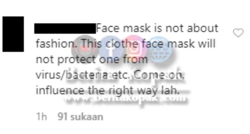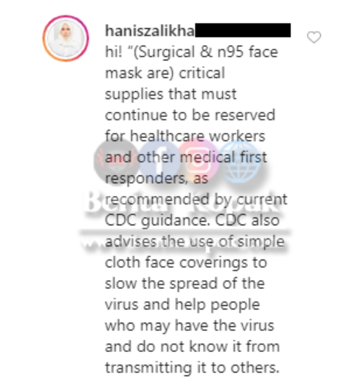 Namun Hanis telah menerima satu komen teguran daripada seorang netizen tentang penggunaan mask kain :