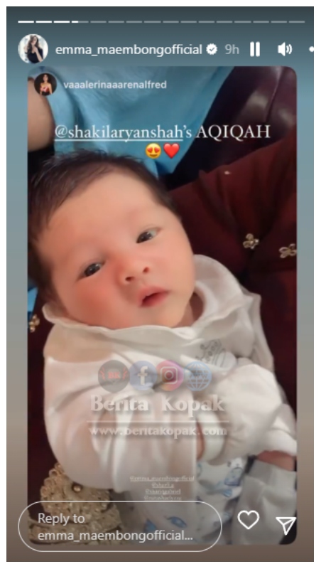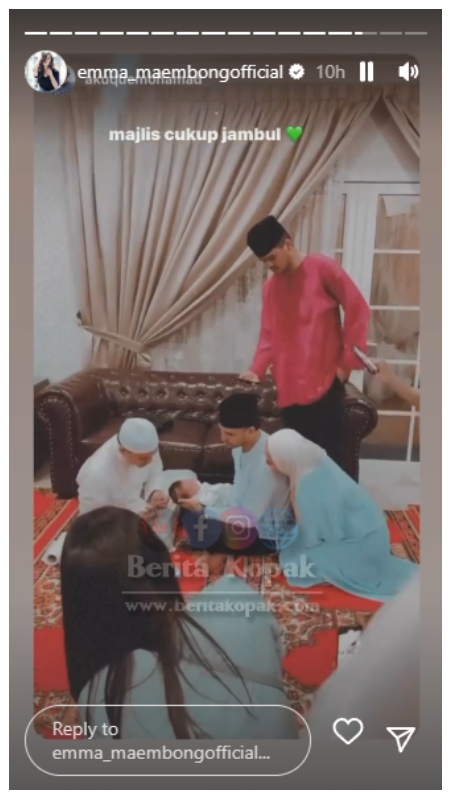 Meninjau Instastory milik Emma, telah dimuatnaik beberapa keping gambar dan video yang memaparkan suasana ketika berlangsungnya majlis aqiqah dan cukur jambul baby Aryan. Majlis ini turut dimeriahkan dengan kehadiran rakan-rakan artis yang lain.
