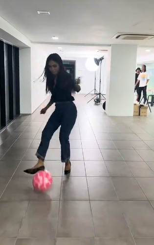” Eh Kasut tumit pun leh main ? tak takut terjatuh kah kah.. aku pulak yang seram tengok bella main bola pakai heels.. ni level pro dah.. “