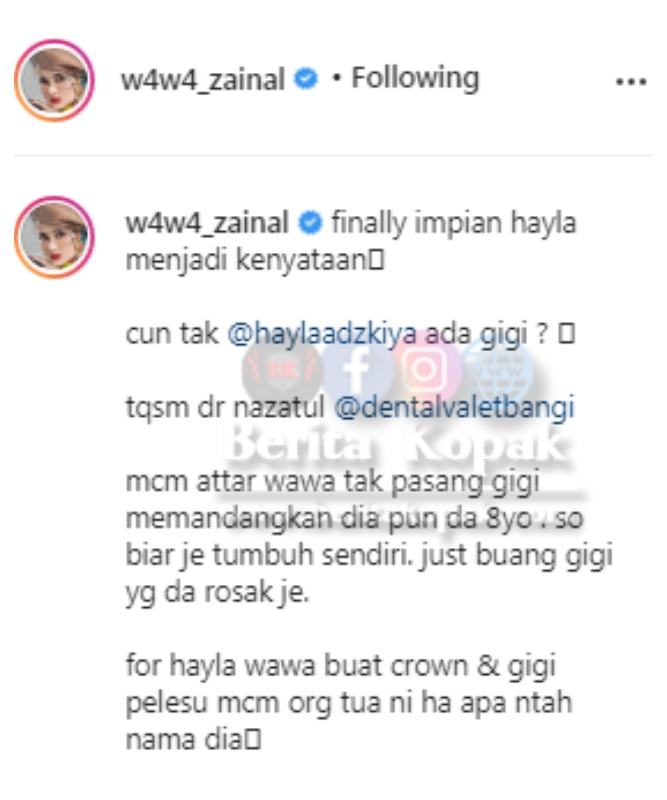 Meninjau akaun Instagram Wawa, telah dikongsikan video yang memaparkan Hayla membuat gigi p4lsu. Menurut Wawa, sudah lama Hayla mengimpikan untuk mempunyai gigi yang cantik seperti orang lain.