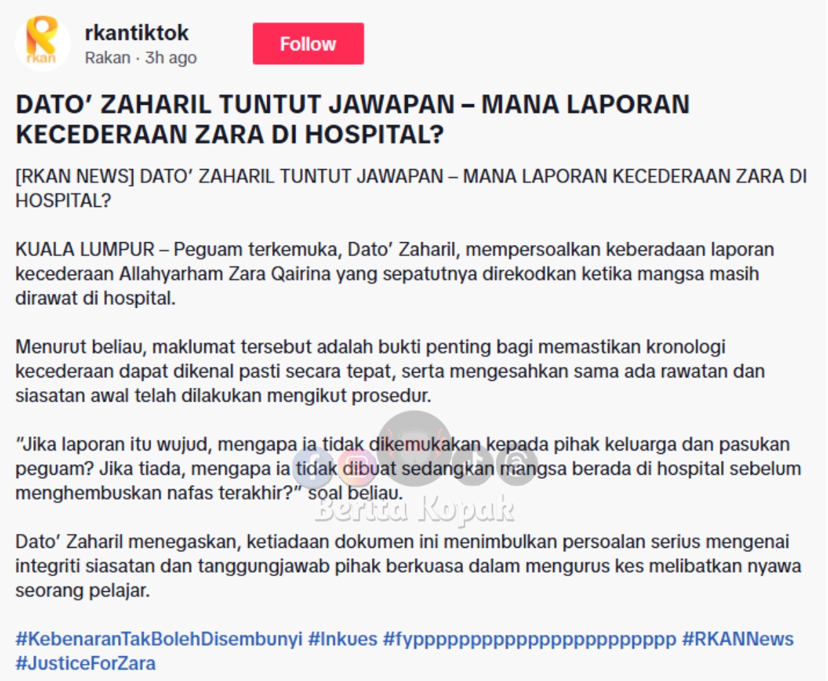 Menerusi perkongsian terbaru di akaun Tiktok Saya Zaharil, telah dikongsikan satu video terbaru yang memaparkan Dato’ Zaharil bersuara lagi mengenai kes adik Zara Qairina. Sebelum ini juga Dato’ Zaharil dengan lantang mempersoalkan tindakan pihak berkuasa dalam menguruskan kes Zara.