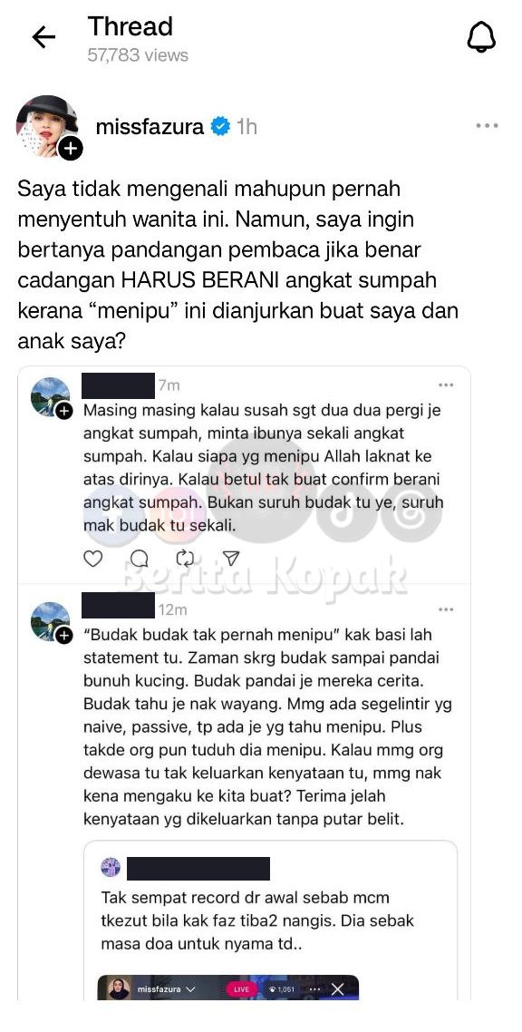 Meninjau ke akaun Threads Fazura, satu posting Fazura yang memberi respon terhadap komen seseorang netizen yang mengecam Fazura telah meraih perhatian ramai. Individu tersebut meminta Fazura dan anaknya, Nur Fatima Aisya mengangkat sumpah mengenai video yang tular sebelum ini.