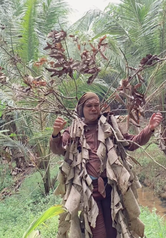 Tetapi yang ini versi bahan semulajadi dan low bajet seperti kata warganet. Lagi menarik, parodi ini dibuat di kawasan kebun kelapa sawit. Ekspresi muka Hadrey dengan ‘baju ranting’ itu membuatkan warganet yang melihat rasa terhibur.