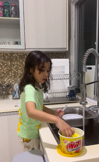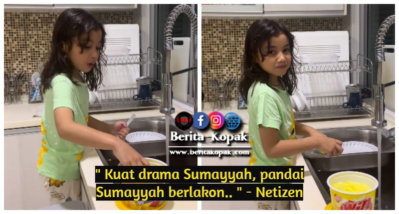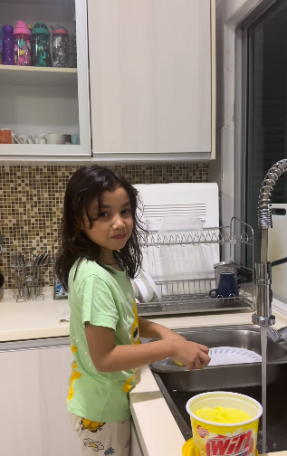 ” Sumayyah cantik.. Rajin nya summayah basuh pinggan.. hahah muka dia marah tu mcm mama dia dah.. mata aku nmpak botoi ayaq ank psl pnuh dlm rak atas.. “