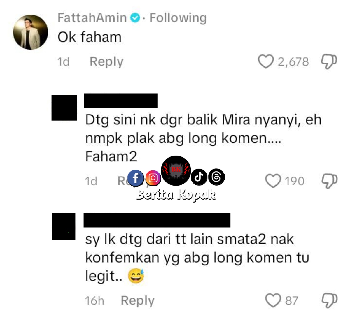 Komen Fattah juga meraih perhatian ramai. Wah apa agaknya yang difahami oleh Fattah dengan nyanyian oleh Amira itu.