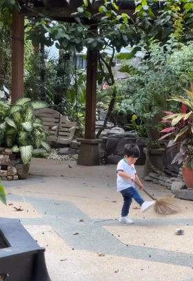 ” Ololo humble sungguh anakanda Dato’ Seri Khalid Jiwa ni. Rajinnya lah dia, kecik-kecil dah pandai menyapu.. “