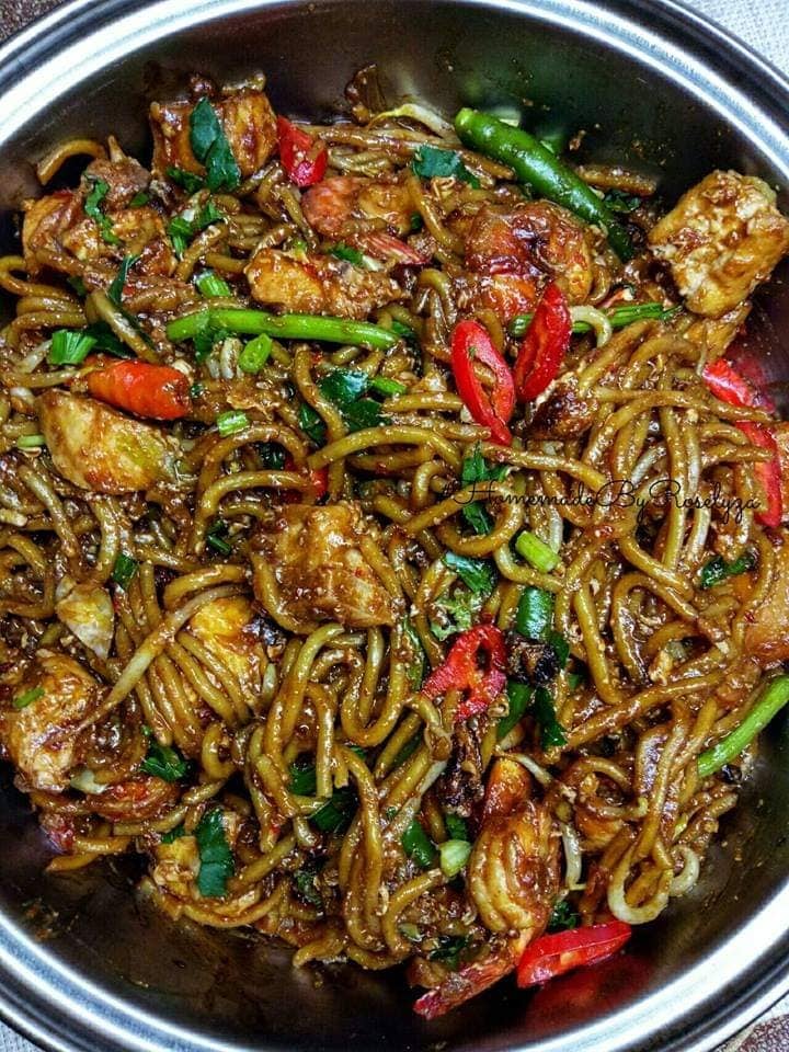 Mee kuning celur dulu dgn air panas. Panaskan minyak, tumis bawang merah, putih yg ditumbuk ..masak sehingga kekuningan, seterusnya masukkan cili kisar. Tumis sampai pecah minyak..baru masukkan ayam,udang, lepas tu tuang kicap, sos cili, sos tiram, sos karamel ..kacau2 jap ..tambah air sikit, masukkan sedikit garam …masukkan mee kuning, masukkan semua jenis sayur yg ada,pecah kan telur 2 biji ..gaul semuanya sampai masak, nk tambah kicap pun boleh ..x suka ltk kicap pun boleh je…