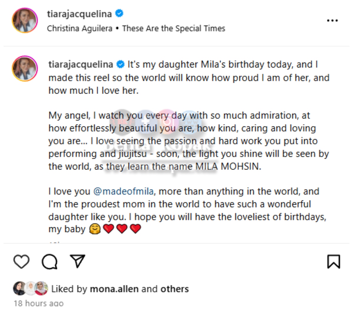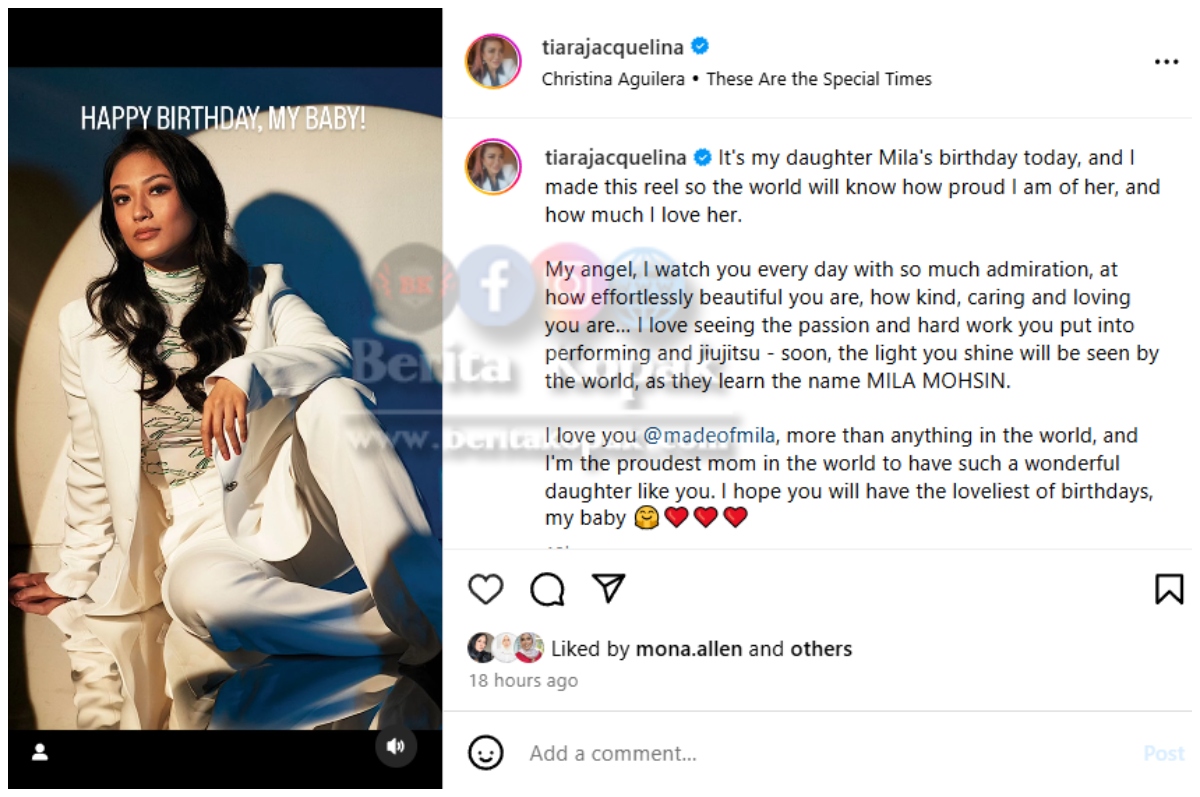 Menerusi perkongsian Puan Sri Tiara Jacquelina di akaun Instagram miliknya, telah dikongsikan koleksi gambar anak perempuan hasil perkahwinannya bersama arwah Hani Mohsin bernama Hani Karmila Mohsin. Ini adalah bersempena hari lahir Mila yang jatuhnya pada hari ini.