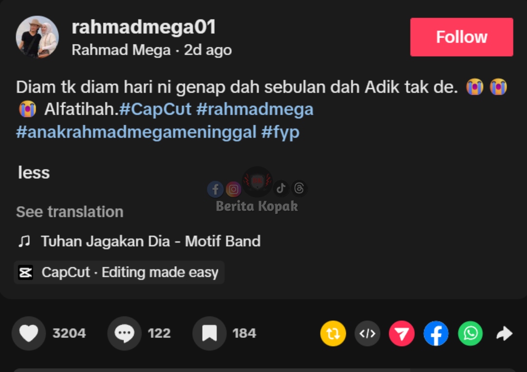 Pada bulan lalu, penyanyi Rahmad Mega berkongsi mengenai anak istimewanya, Nur Ara Elisya telah pun pergi buat selama-lamanya. Perkongsian khabar duka itu diberitahu sendiri oleh Rahmad menerusi sebuah video yang dimuatnaiknya di akaun Instagram.