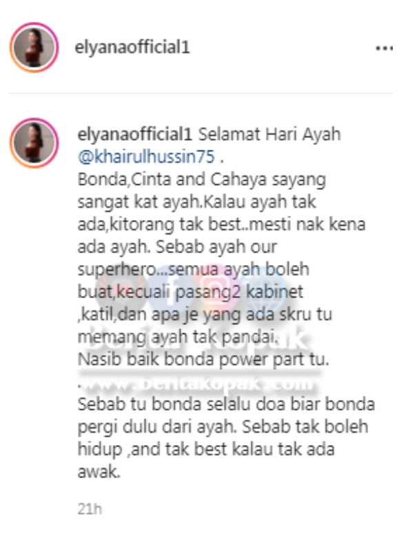 Ujar Elyana di kapsyennya, suaminya adalah superhero mereka sekeluarga dan jika tiada ayah, tidak ceria hidup mereka semua. Di penghuj0ng kapsyennya, Elyana memberitahu dia selalu berdoa agar dia ‘pergi’ dahulu sebelum Khairul kerana tidak boleh hidup tanpa Khairul ada di sisi.