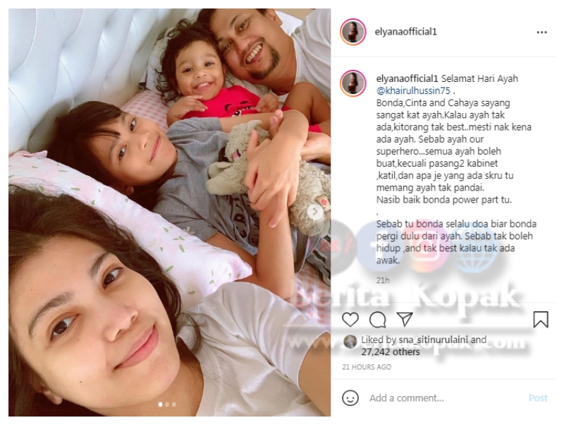 Meninjau akaun Instagram Elyana, telah dikongsikan beberapa keping gambar Elyana bersama Khairul dan 2 anak mereka, Cinta dan Cahaya bersama ucapan untuk suami tersayang, Khairul Anuar sempena hari Bapa yang disambut semalam.
