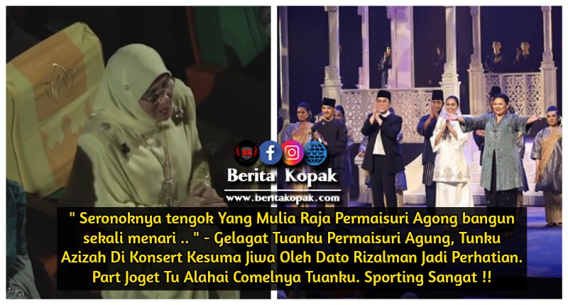 Seluruh isi dewan memang terhibur dengan persembahan Kesuma Jiwa yang memuk4u ini. Lihat sahaja gelagat Tuanku Permaisuri yang sporting. Joget Tuanku memang mahal la. Terbaik Tuanku. Kami di Berita Kopak mengucapkan tahniah buat Dato’ Rizalman di atas kejayaan konsert Kesuma Jiwa ini.