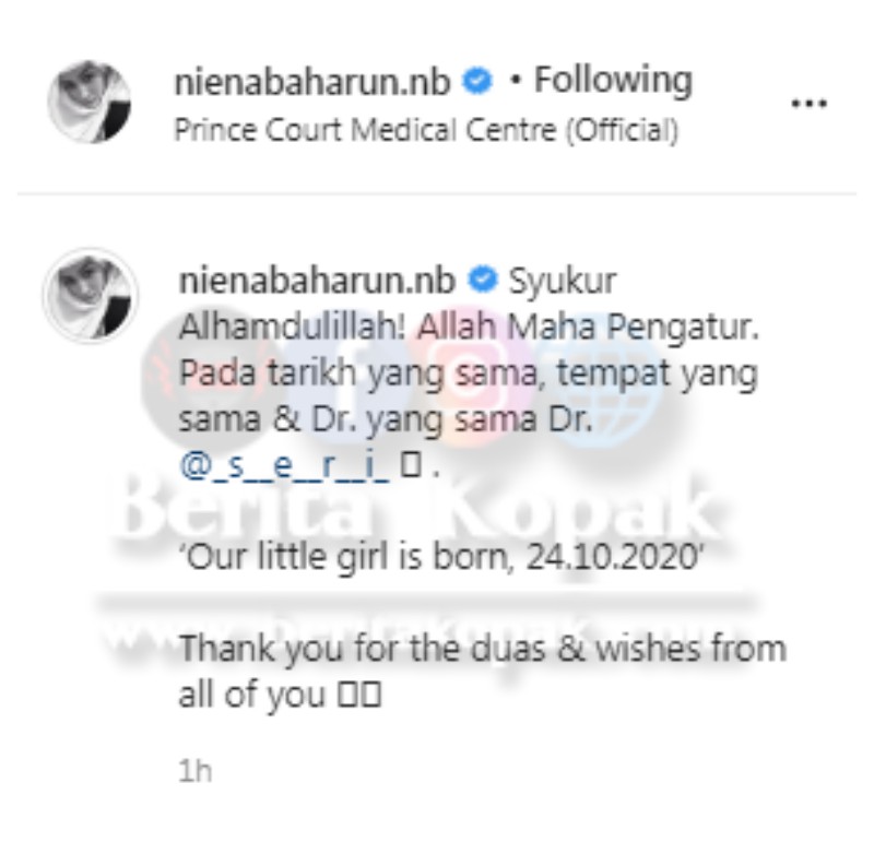 Niena turut menulis rasa syukurnya di atas kelancaran proses bersalinnya ini. Tempat yang sama, doktor juga yang sama dan paling istimewa tarikh yang sama seperti Adiel, 24 Oktober. Turut kelihatan sama di dalam gambar tersebut, suami Niena Dato’ Aliff Firdaus dan Doktor Seri.