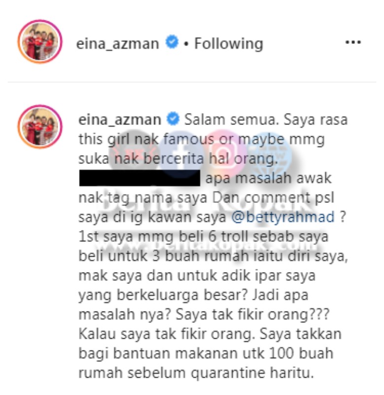 Menerusi akaun Instagram, Datin Eina Azman telah berkongsikan satu screensho0t ruangan komen yang mengaitkan namanya tentang pembelian pan1k oleh seorang netizen. Tindakan netizen ini membuatkan Datin Eina terpanggil untuk memberi respon dan penjelasan lebih jelas.