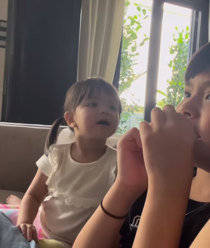 Kemudian Lila cuba mengikut reaksi wajah kakaknya dengan turut sama menutup mulut namun sebaliknya berlaku apabila dilihat Lila kelihatan seperti sedang ketawa. Eh, Lila ni menonton filem ser4m ke atau filem lawak. Nampak macam kelakar pula.